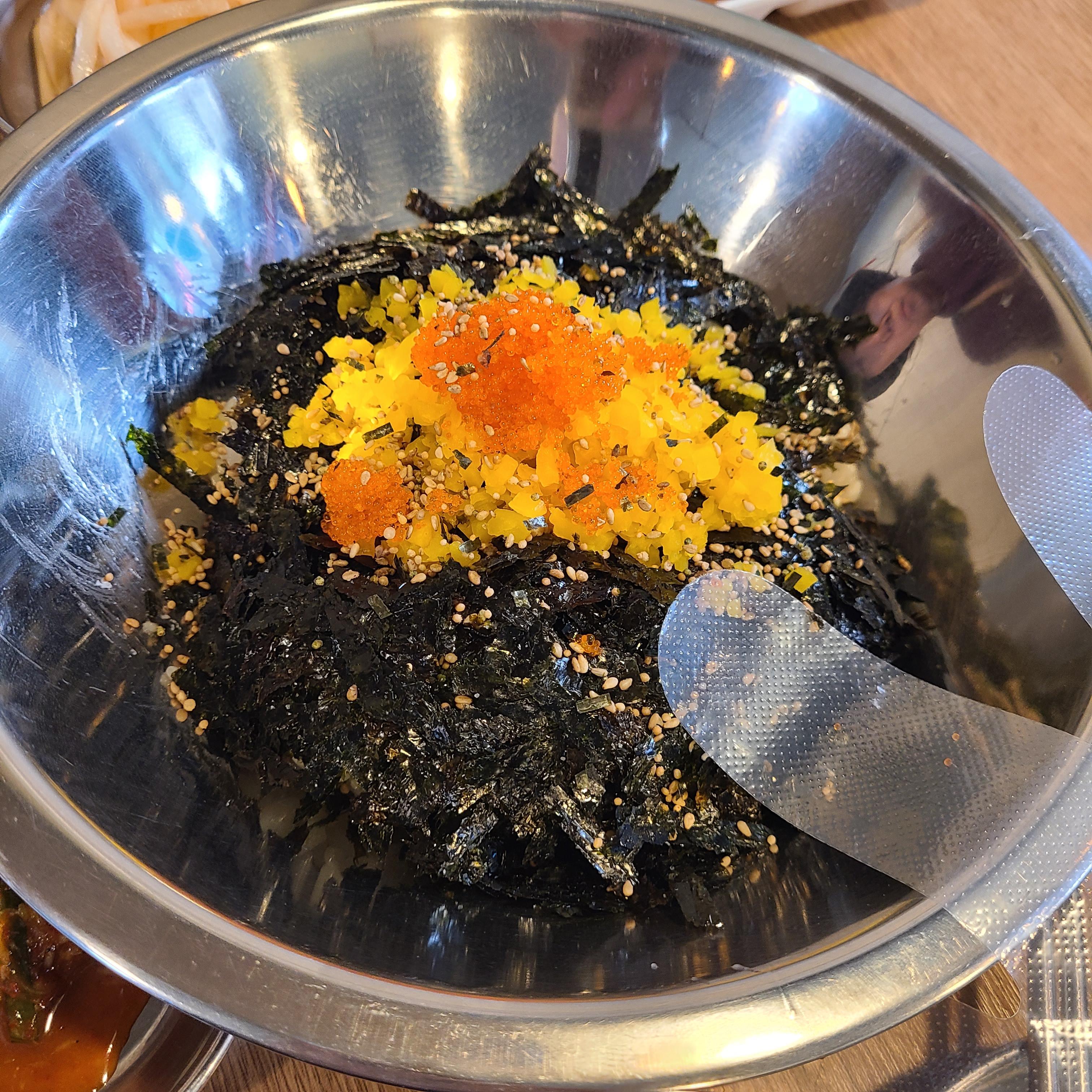 밥에 김가루 듬뿍올려주시고 단무지와 날치알이 올려져 나옵니다!