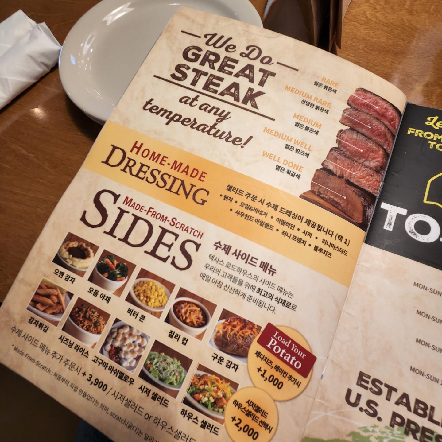 스테이크를 주문하면 사이드 메뉴 2가지를 고르실 수 있습니다!