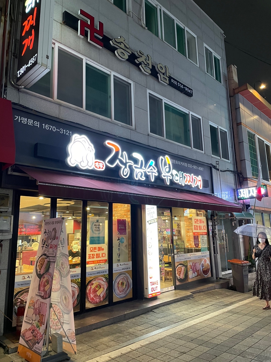 < 장금수 부대찌개 부평문화의거리점 > ▣ 주소 : 인천 부평구 부평대로 38번 길 5 ▣ 번호 : 0507-1426-4569 ▣ 영업시간 : 매일 11:00 - 22:00 ▣ 주차 : 썬 주차장 이용 시 70분 무료 주차 ▣ 기타 : 단체석, 주차, 포장, 배달 가능